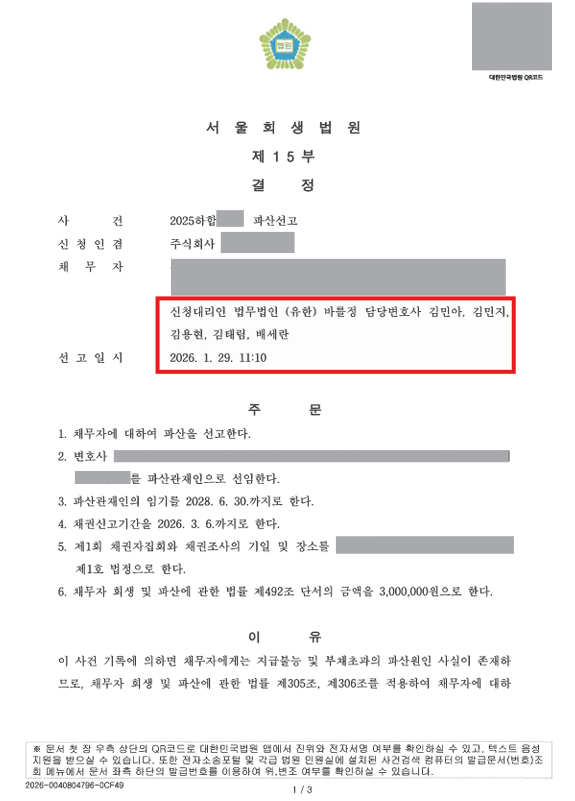 그 결과 법인파산 선고 결정을 받을 수 있었습니다.
