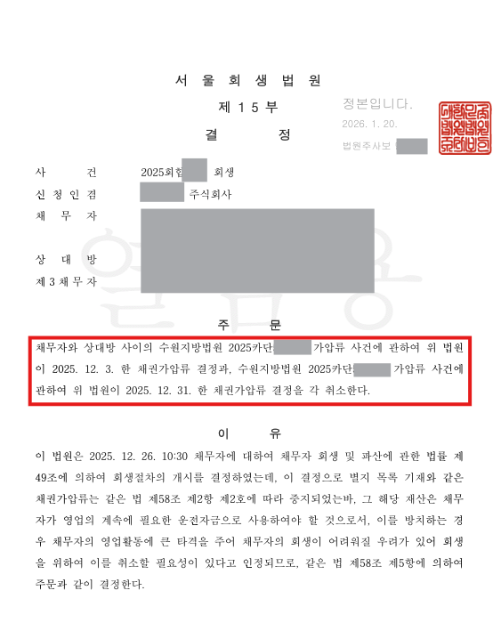 그 결과 서울회생법원으로부터 개시신청전 수원지방법원에서 결정한 '기존 채권가압류 결정을 취소한다'는 판결을 받아낼 수 있었습니다.