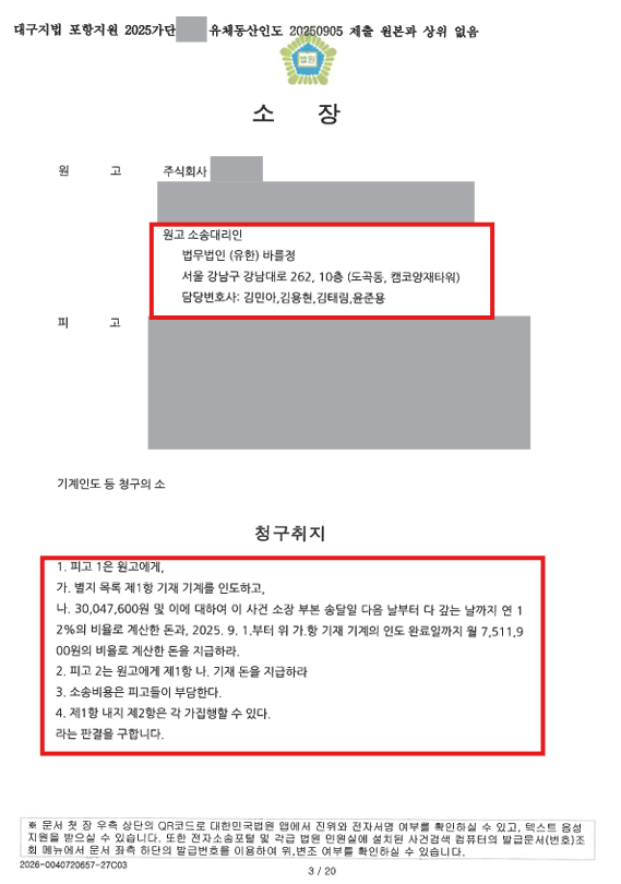 -법인회생 기업을 상대로 한 기계인도 청구, 법인회생 전문 법무법인(유)바를정이기에 가능합니다.