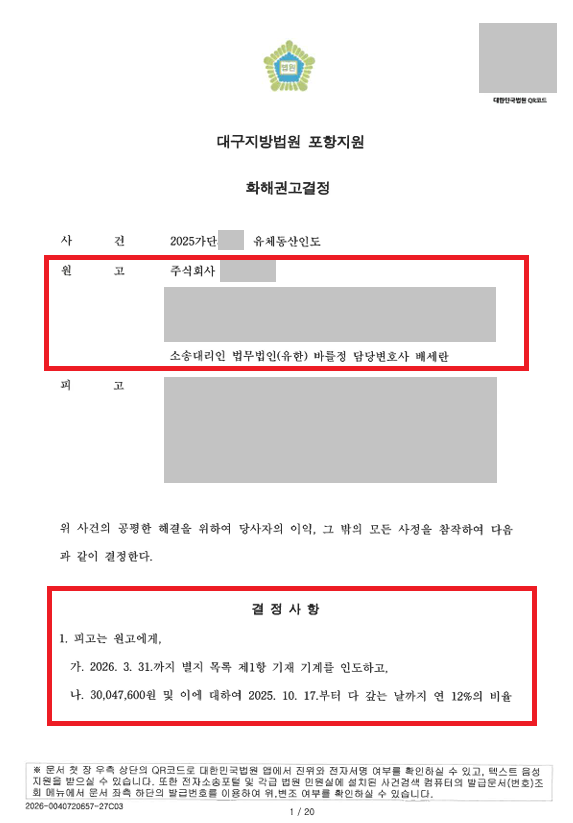 이에 따라 화해권고결정을 통해 원고 청구취지 전부를 인용받을 수 있었습니다.