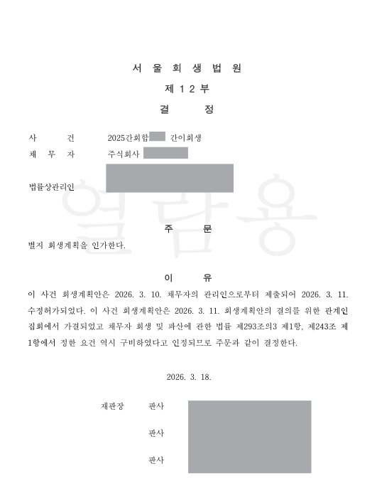 [서울회생법원, 제조업 전문 기업 회생계획 인가 결정]