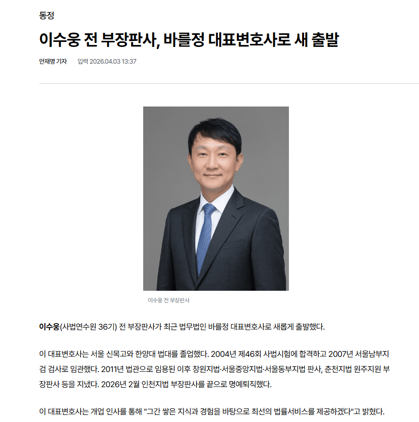 이수웅 전 부장판사, 바를정 대표변호사로 새 출발
